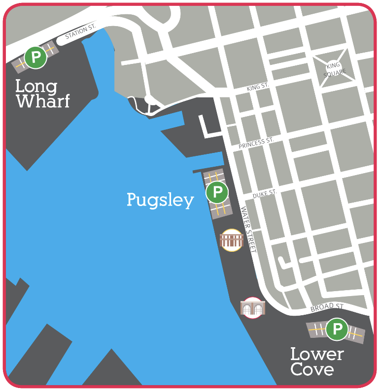 Port Saint John offre la possibilité d’un stationnement mensuel dans trois endroits pratiques du centre-ville. Le parc de stationnement de Long Wharf est situé au bout de la rue Station, près du Passage du port; le parc de stationnement Pugsley se trouve sur la rue Water, entre les rues Duke et Princess, et celui de Lower Cove se situe sur la rue Broad, au pied de la rue Prince-William.